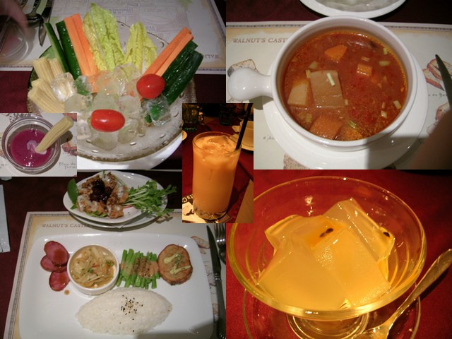 整個套餐裡面有沙拉、湯、主餐、果凍、飲料,可以吃得滿飽的,沙拉的沾醬是藍莓的,還不錯吃。要換濃湯還要加錢,要換果凍也要加錢,越加越貴。