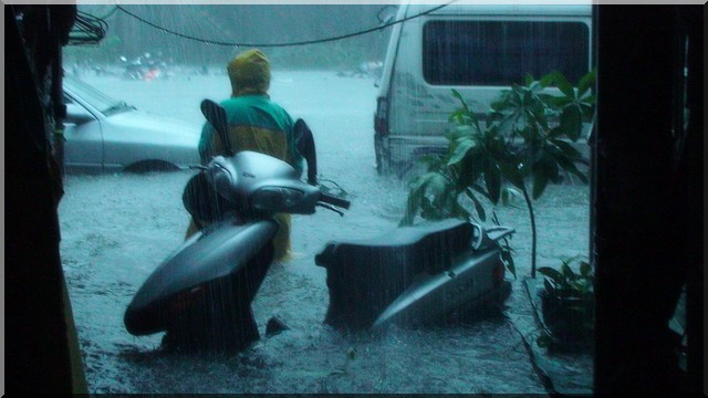 媽媽去撿漂走的鍋子,爸爸的機車被泡在水裡