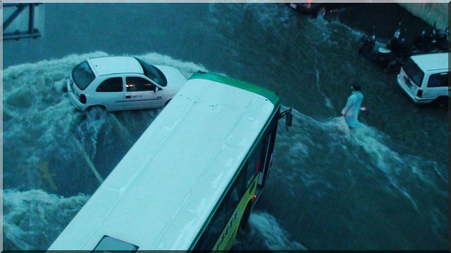 公車開到一半被大水卡住無法前進,還來不及知道停止上課的學生們都被困在公車內