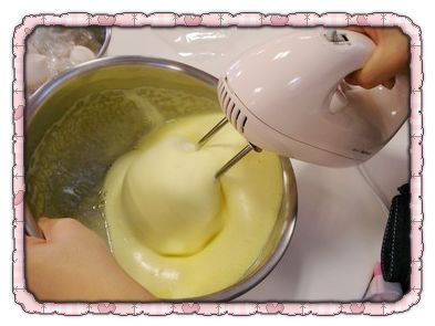 攪拌蛋和砂糖,先不開電源攪拌幾下,然後打開電源(最強),斜斜的攪拌
