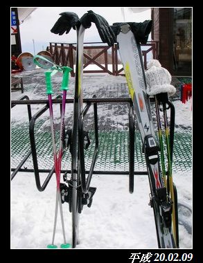 在等其他人,滑雪場有架子放我們的雪具