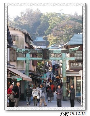青銅の鳥居。江之島的入口,兩側都是海產、土產店還有餐廳