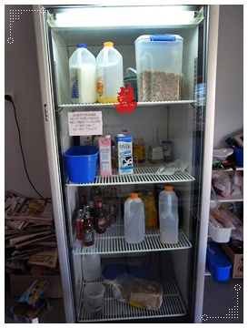 冰箱最上層放著我們的早餐:柳橙汁、鮮奶、優格、麥片、果醬和吐司